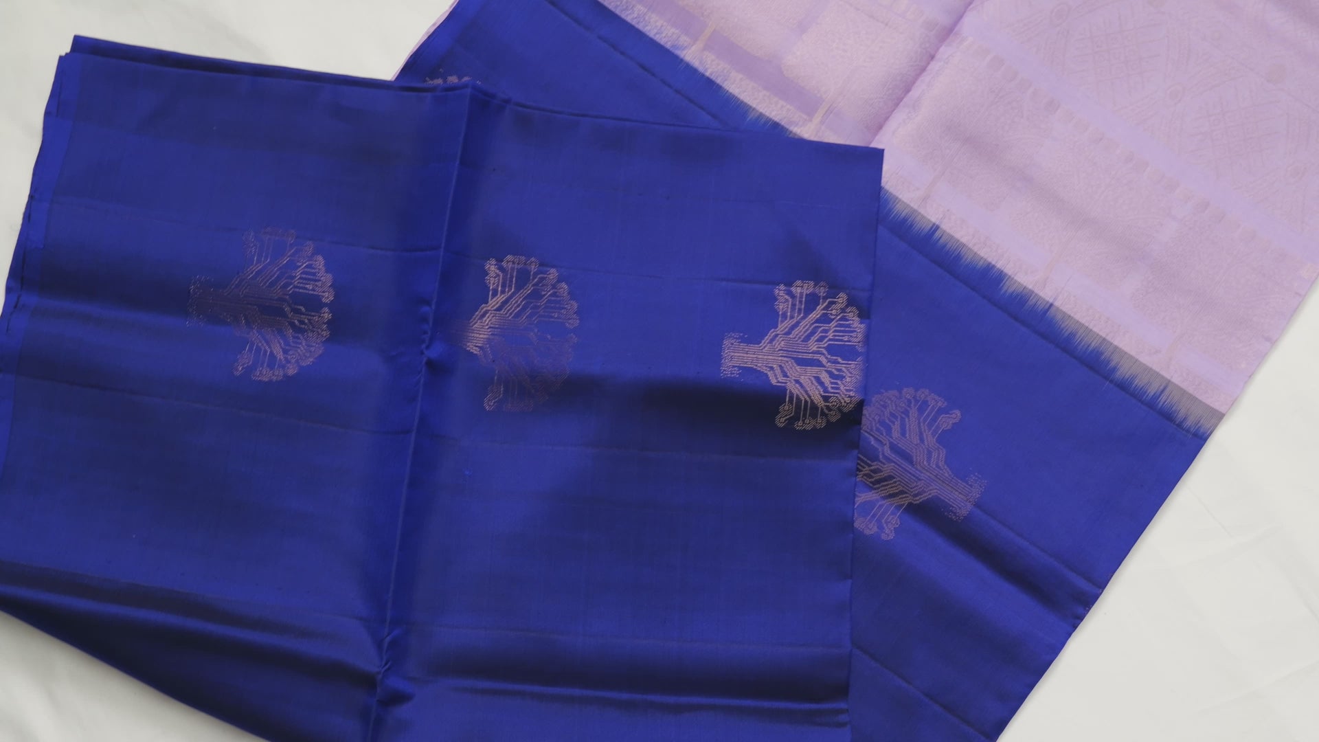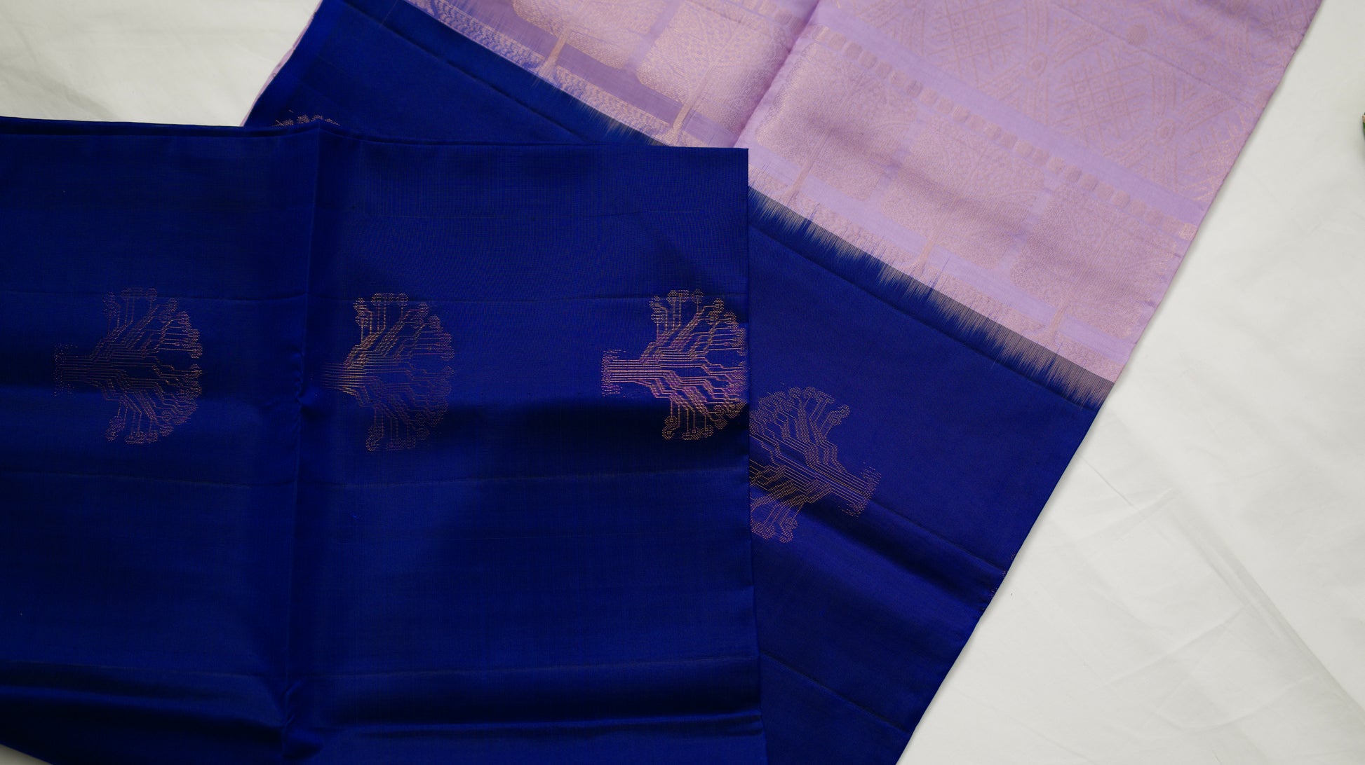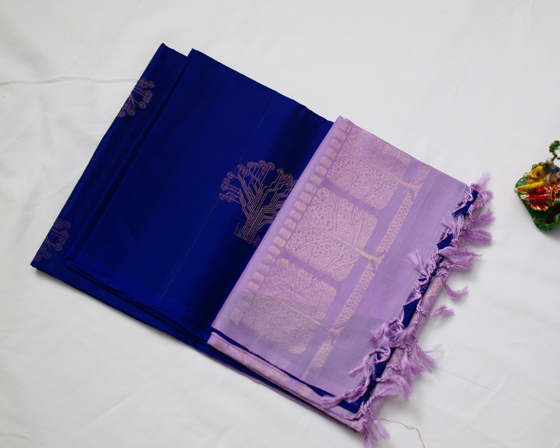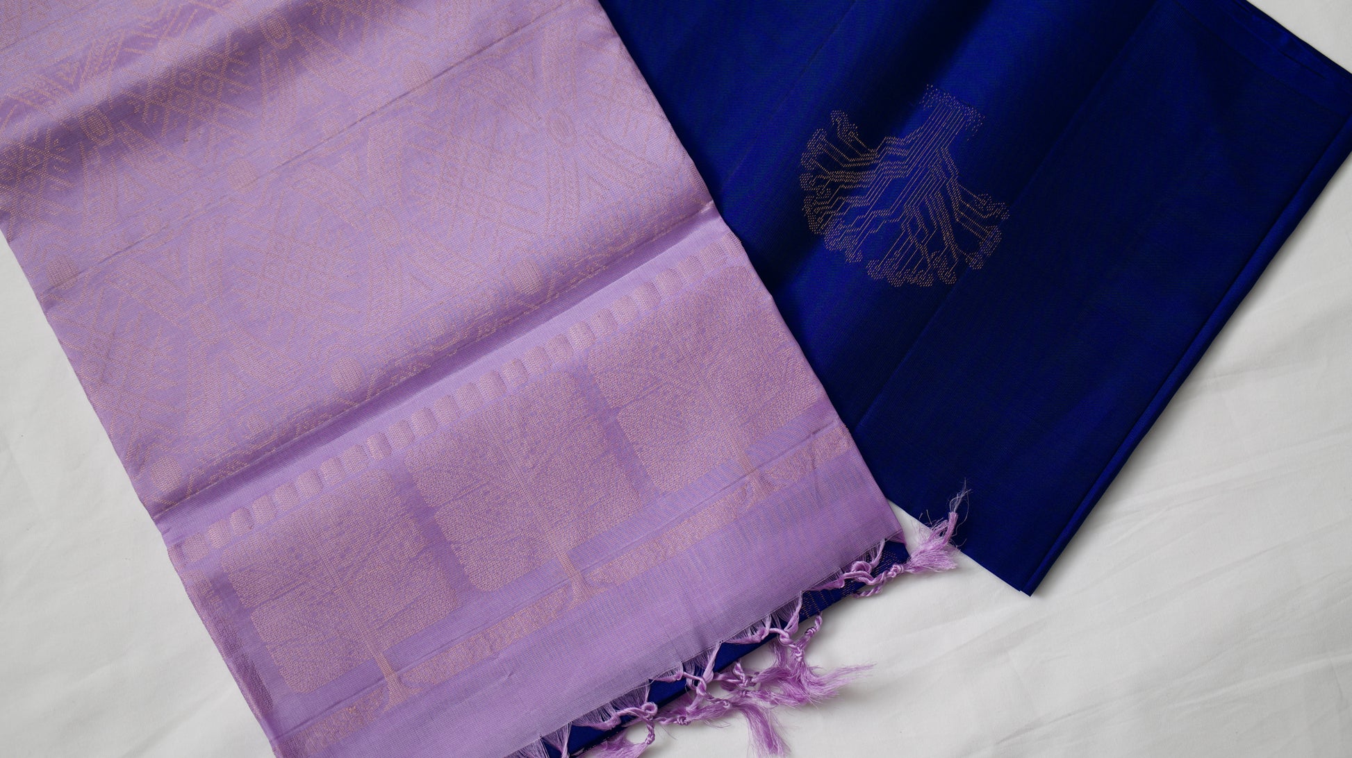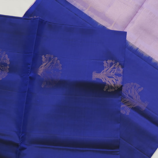 A borderless dark blue saree with lavender coloured pallu and blouse piece.