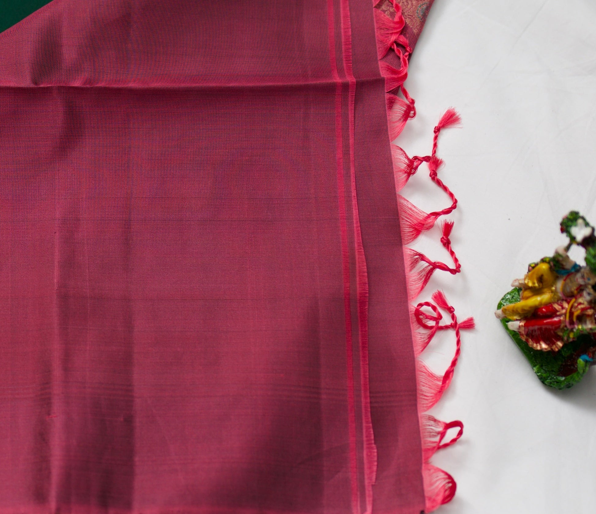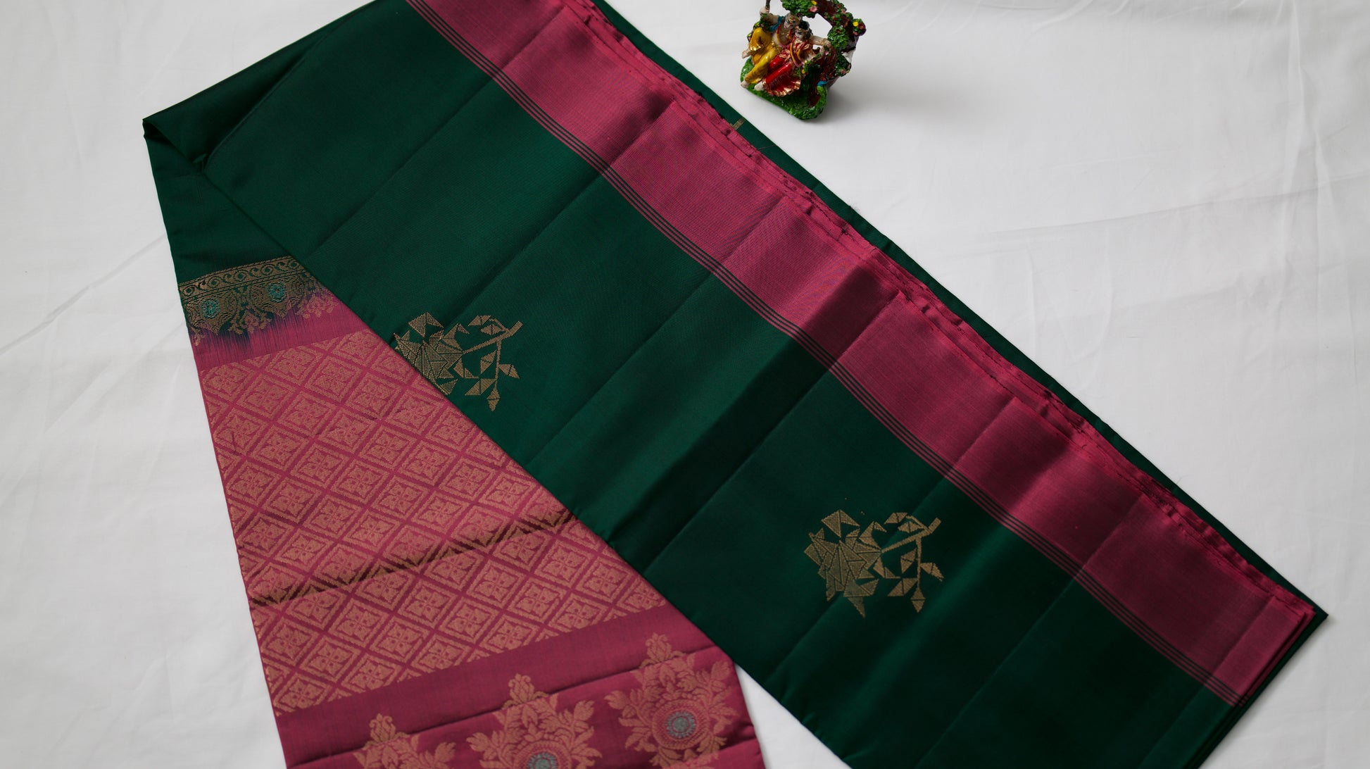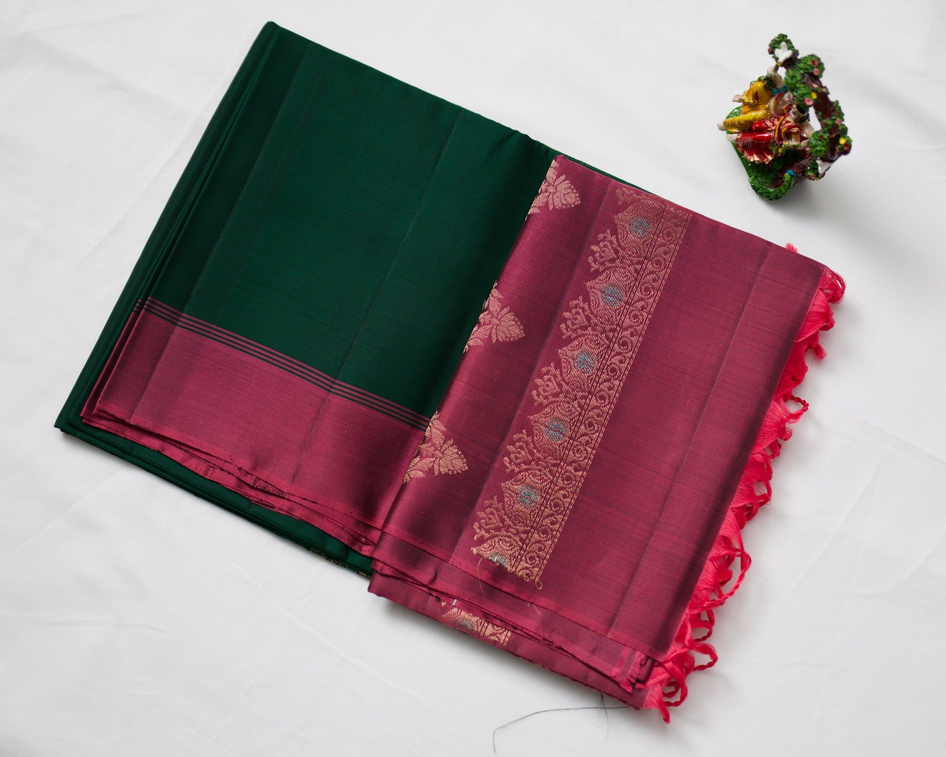 A dark green saree with pink coloured pallu and blouse piece.