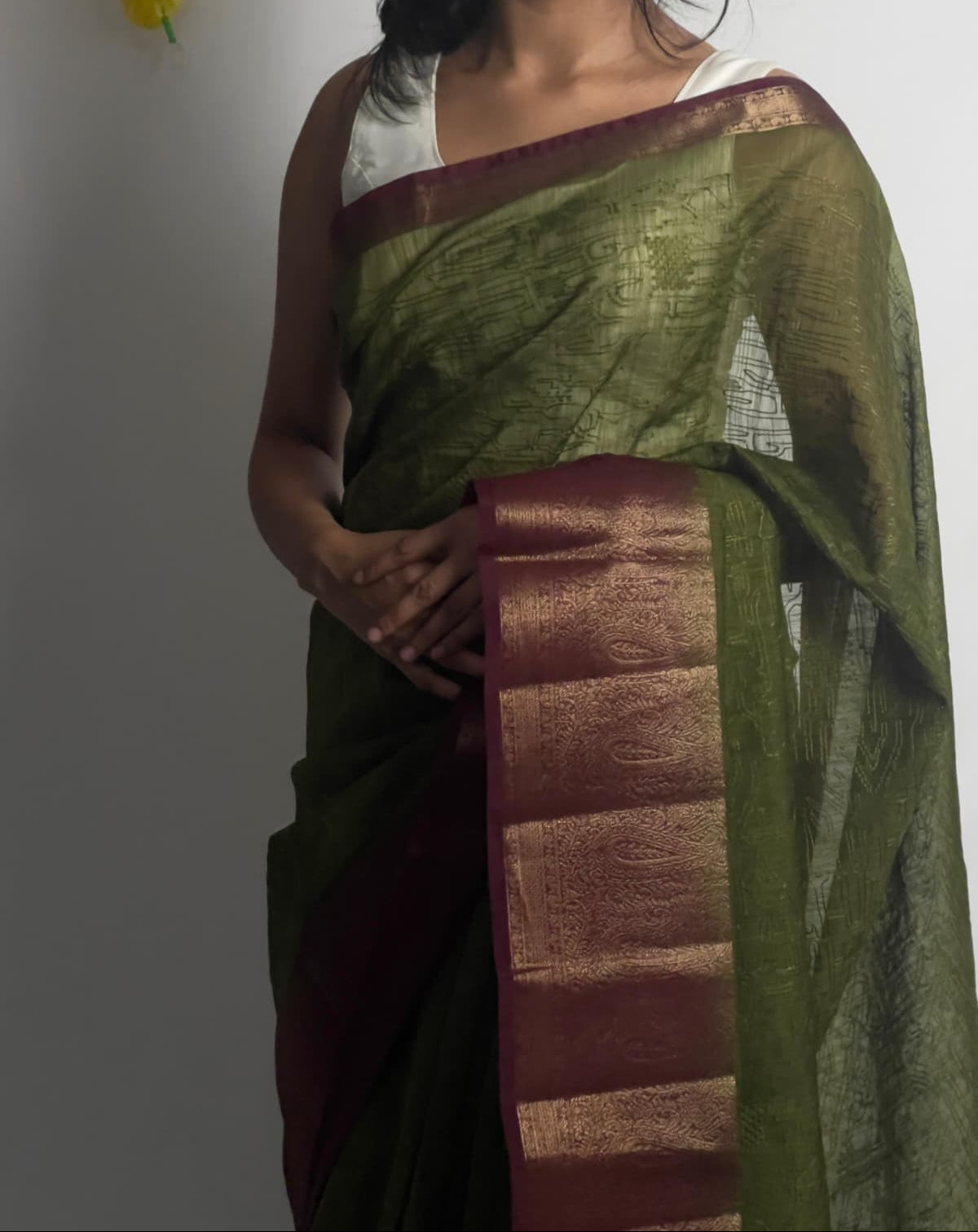 Jute linen Green saree with embroidery and purple pallu
