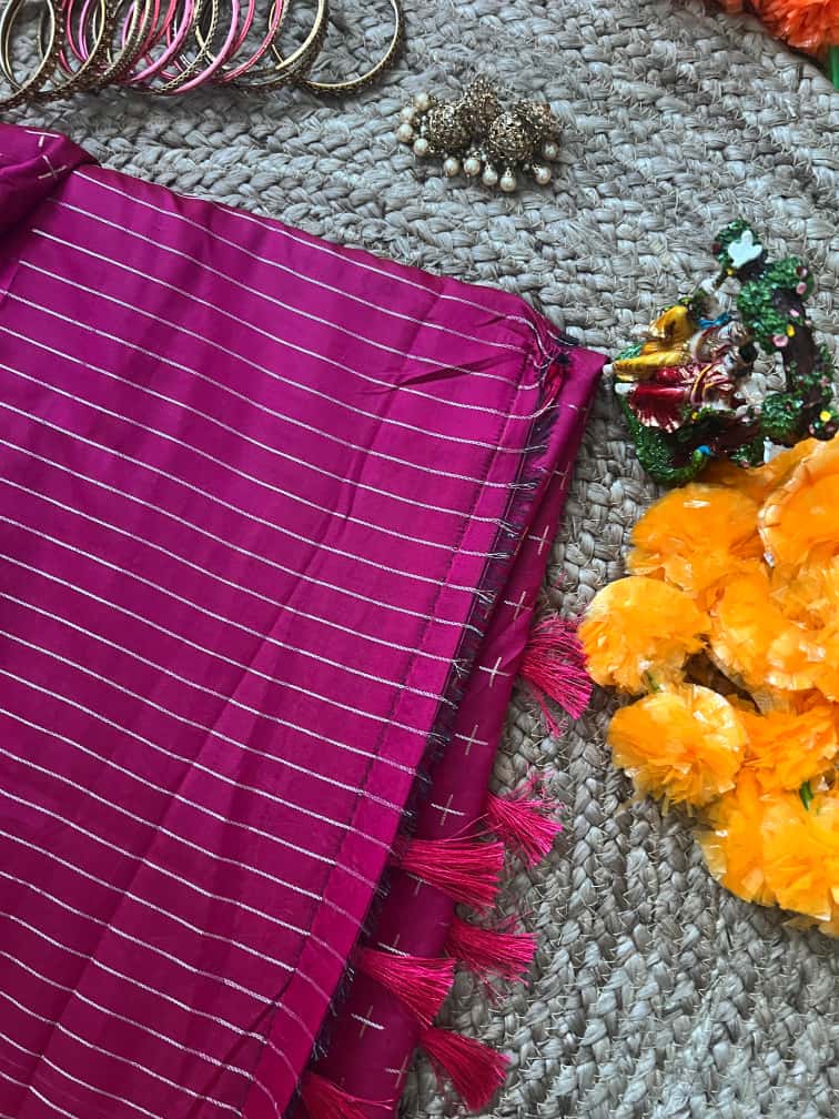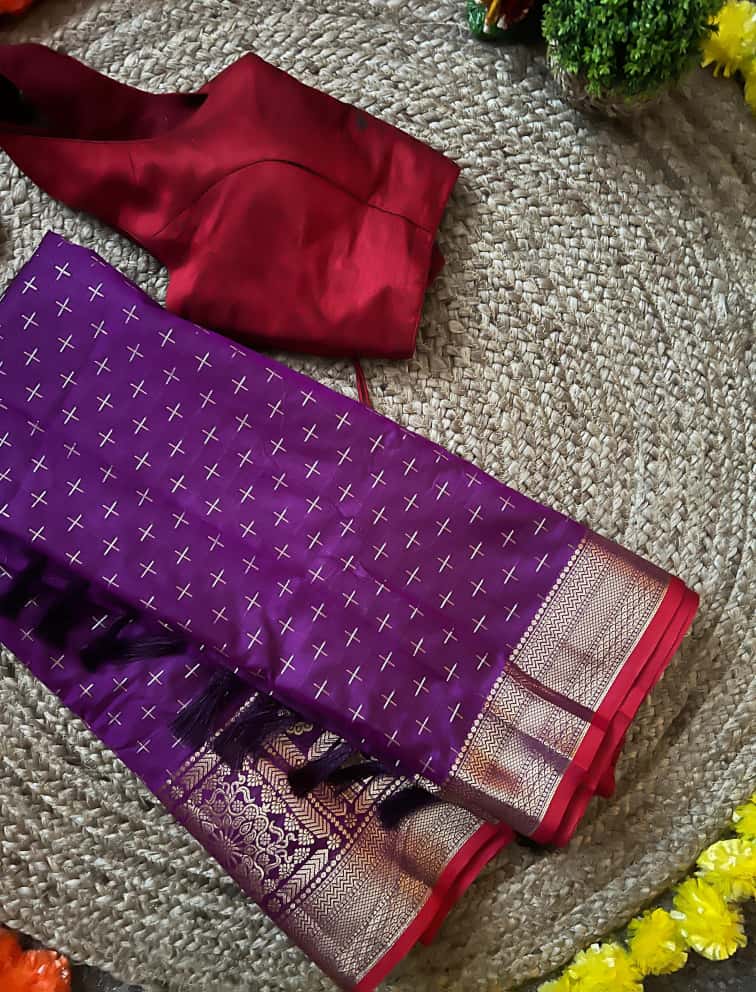 NIVRITI: The Banarasi style collection. Available in seven colours. Striped blouse piece is included as shown in the third image for all sarees
